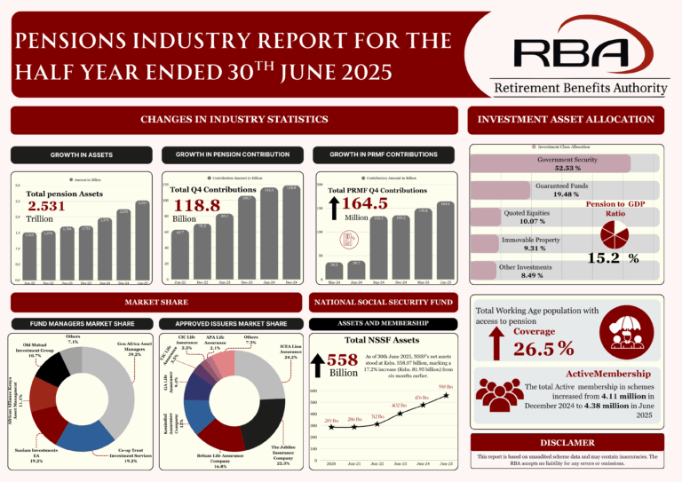 The Kenyan pension industry witnessed significant growth in the first half of 2025, with Assets Under Management (AUM) soaring from Ksh. 2.255 trillion in December 2024 to Ksh. 2.531 trillion by June 2025. According to the June 2025 industry report, this impressive increase of Ksh. 276 billion reflects a robust 12.22% growth rate over the six-month period.